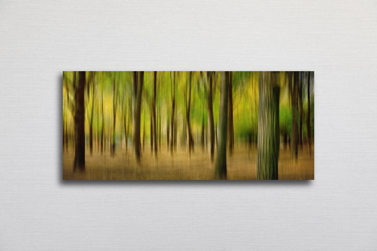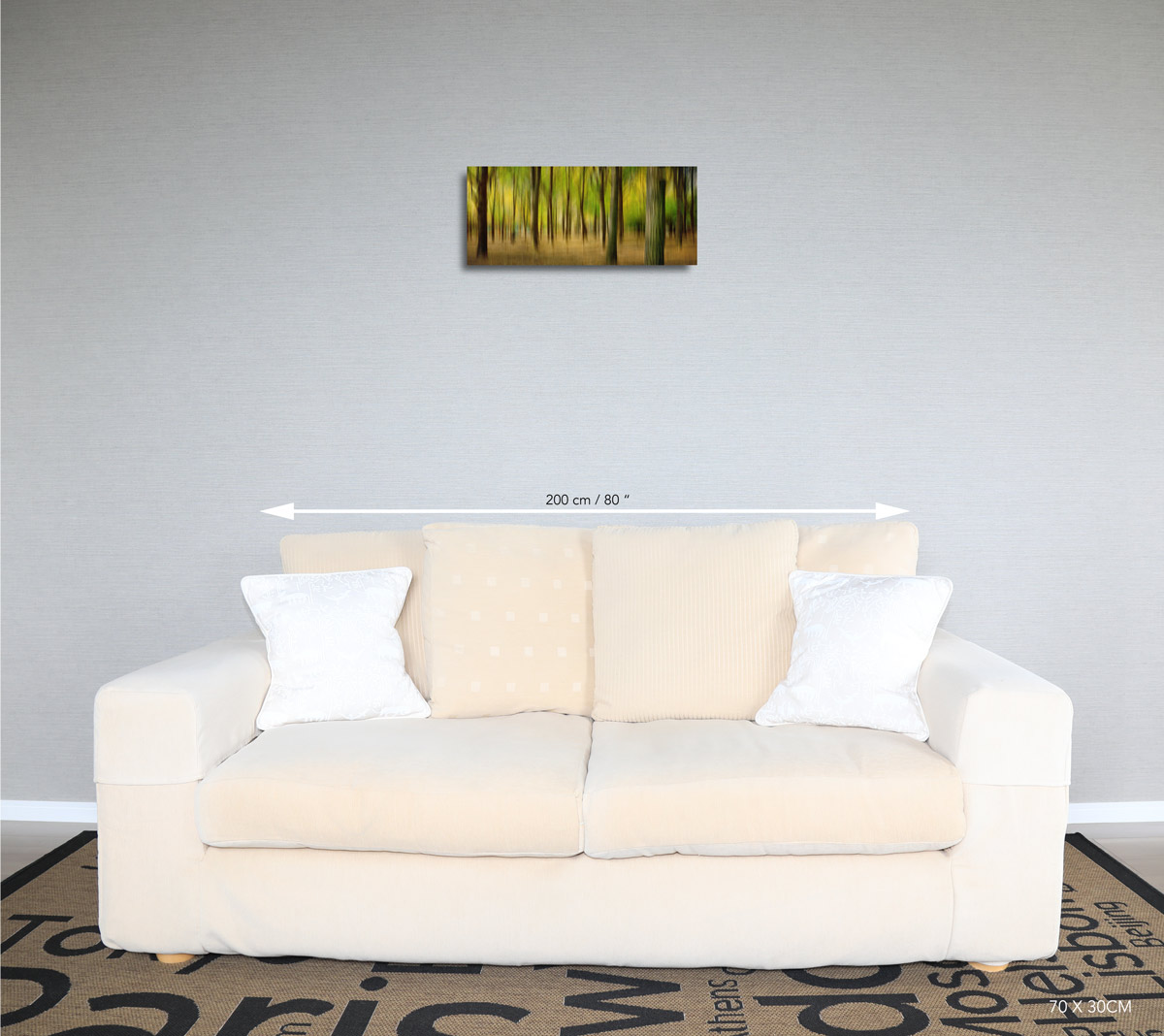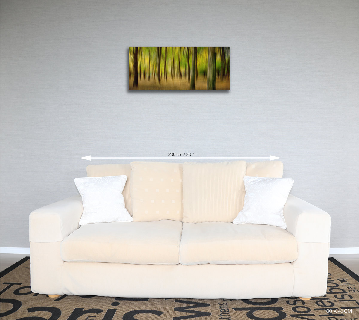 Taken in November in a park in Tokyo when the Ginko trees are undergoing their spectacular colour transformation from green to bright yellow. Using a long exposure technique the sunlit leaves have blended themselves into a vibrant glow. The afternoon sun on the trees has given the piece a lovely depth and warm feel.
