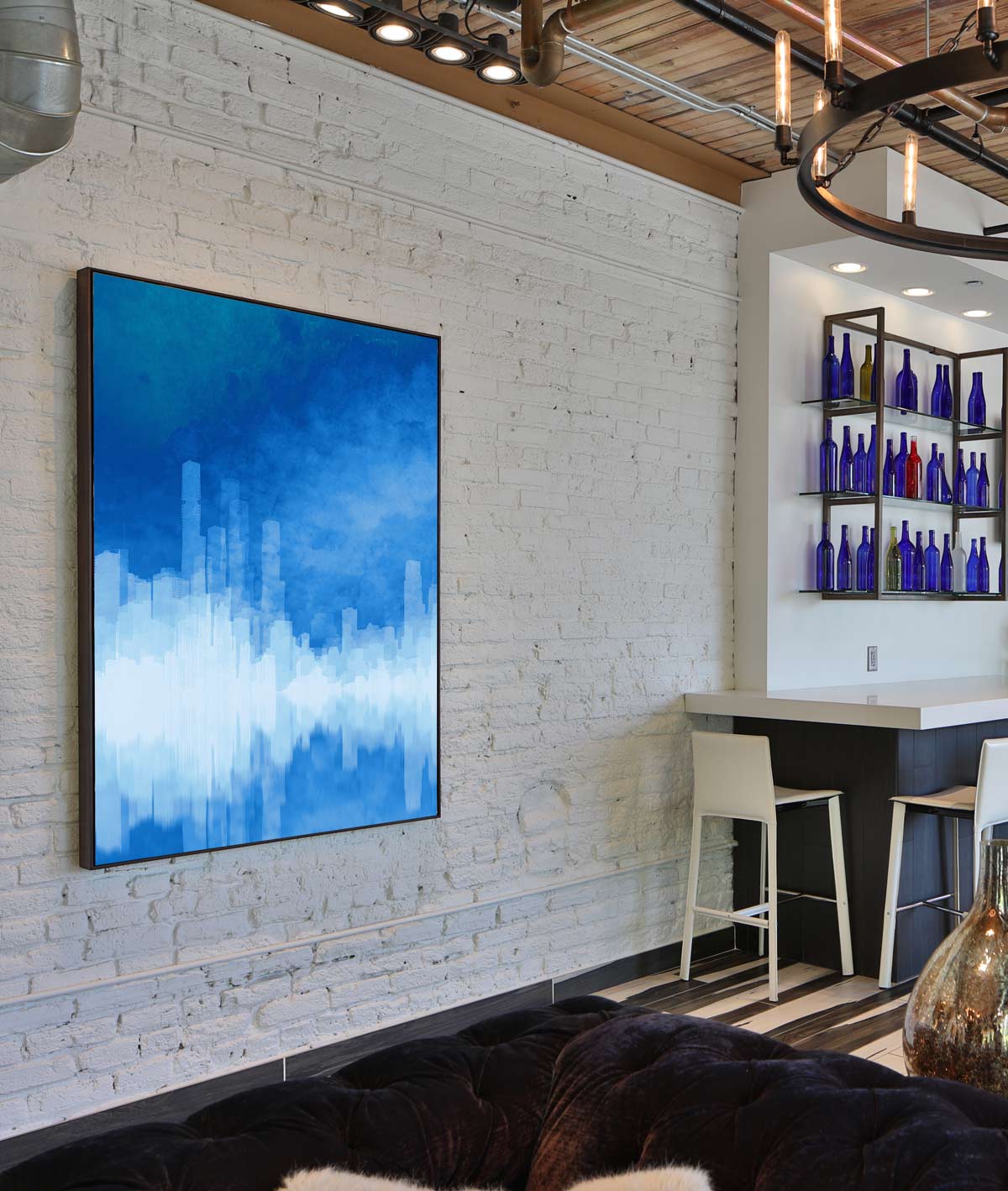 The original photograph was taken from a boat on Lake Michigan which is a great place to get a view of the city architecture. The water in the Great Lakes is known for its crystal clear quality so my aim with this artwork was to recreate this effect. Reflecting both the textured blue sky and the white of the city skyline makes a very dramatic composition.